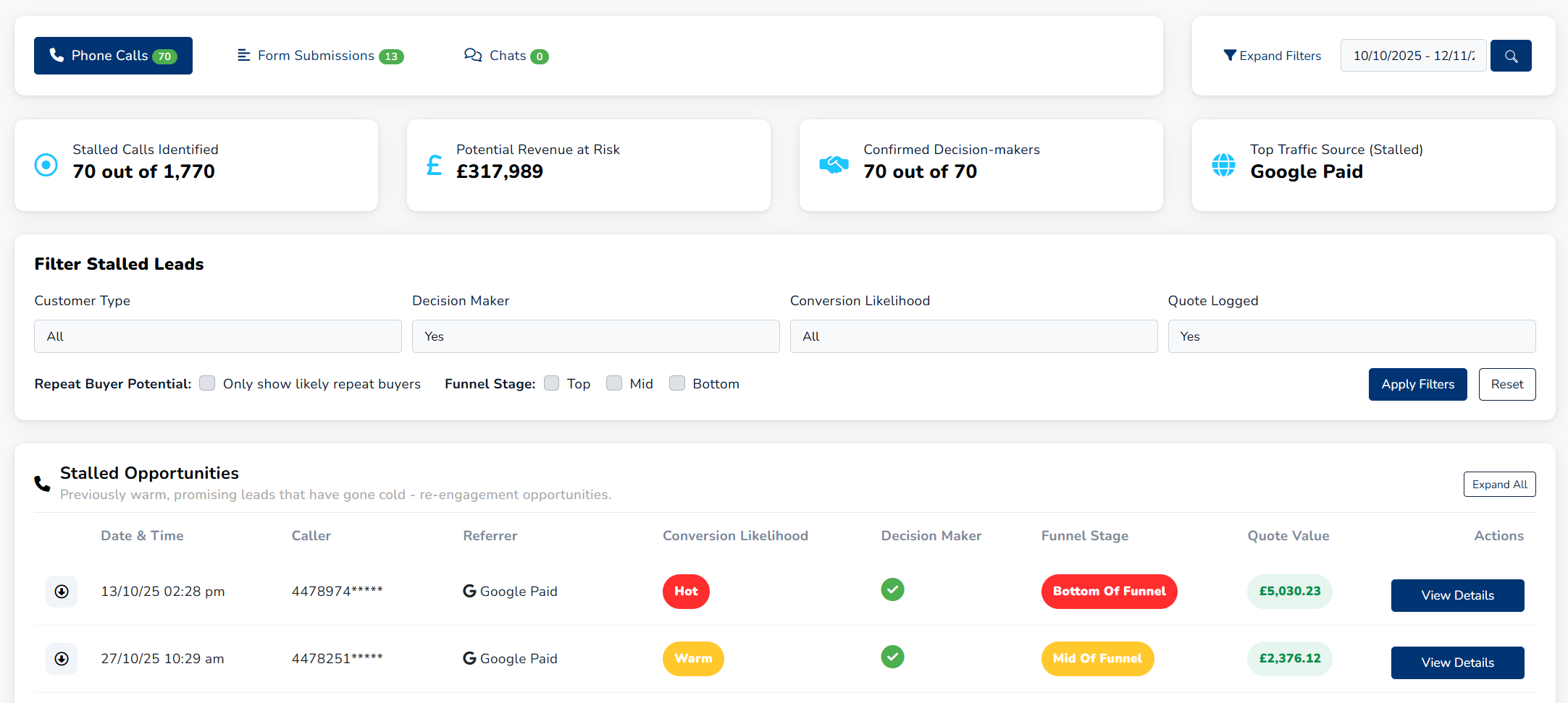 Calls, forms, live chats, and offline enquiries — all tracked in one platform. Attribute leads from Google My Business, Checkatrade, and other third-party sources just as easily as online ads, giving you complete visibility over the full customer journey.